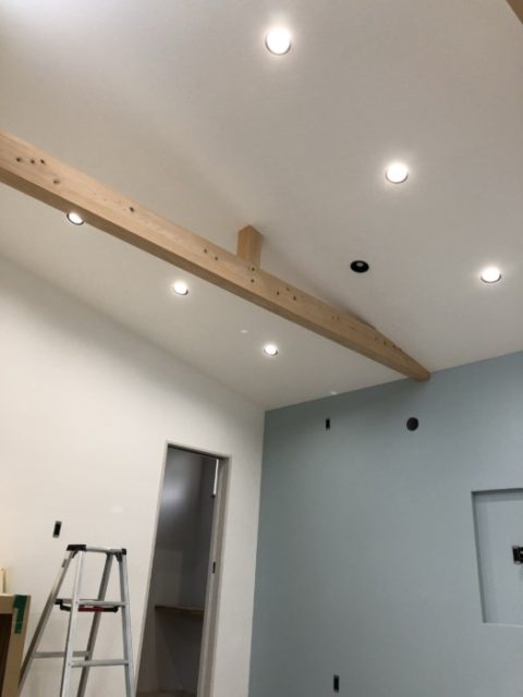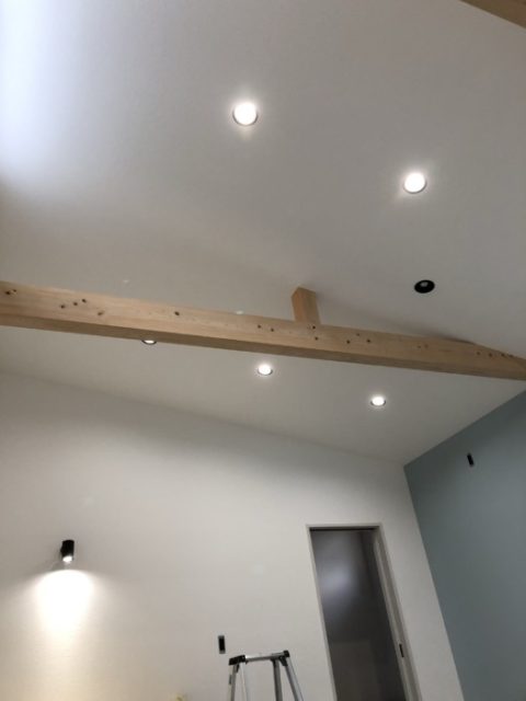 お客様の新築事務所の照明器具を取り付け、点灯試験を行いました。完成が近づいてきました。